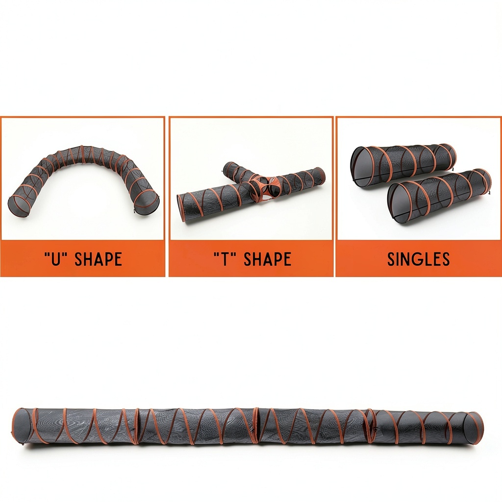 The Hide N Side 4-way pet play tunnel is engineered for durability and versatility, featuring a robust construction with 190T soft polyester fabric and thick alloy steel wiring. This collapsible tunnel measures 16 x 13 x 4 inches and weighs 3.14 kilograms, making it lightweight yet sturdy for repeated use. Designed in a compact style with an orange and black animal theme, it includes a middle connector for easy assembly and is suitable for pets and toddlers aged 3 years and up. The unit count of 4 ensures multiple play configurations, promoting active engagement and agility exercises.