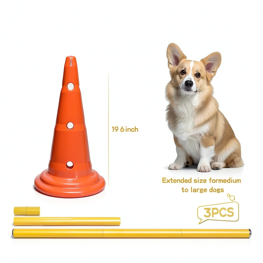 The MDTMR Dog Agility Equipment Set is designed to enhance your dog’s physical abilities and coordination. This comprehensive kit includes 6 agility cones and 3 agility rods, all constructed from high-quality, durable plastic that resists breaking under regular use. The cones stand approximately 19.6 inches tall and can be adjusted with the rods to create ideal training heights. The rods measure about 40 inches in length and feature a disassemblable middle section for flexible setup options. With package dimensions of 23.5 x 11.4 x 11.25 inches and a weight of 6.35 pounds, this set is portable and easy to store. It supports effective agility training by allowing different combinations to challenge your dog’s speed and maneuverability.